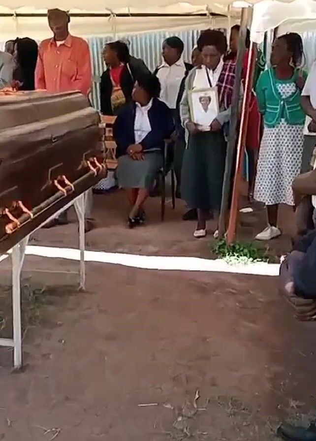 group of people gathered outside under a tent, likely for a funeral. A brown coffin with gold-colored handles rests on a white metal stand. Some attendees are standing, while others are seated. One woman holds a framed photo of a woman. The ground is dirt with patches of grass. The setting appears to be an outdoor area.