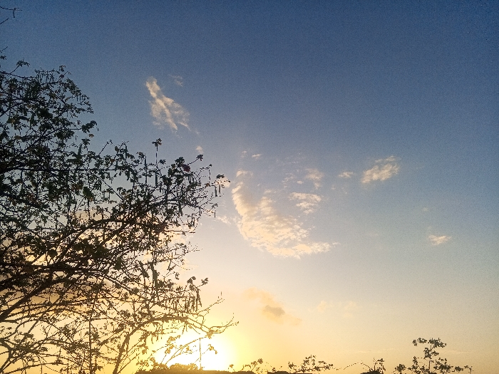 A silhouette of a tree with seed pods fills the lower left of the frame. The sun sets on the horizon in the lower center, casting a golden glow. Wispy clouds are scattered across the blue to golden gradient sky. Smaller trees are sparsely distributed along the horizon on the right. The scene captures a serene sunset.