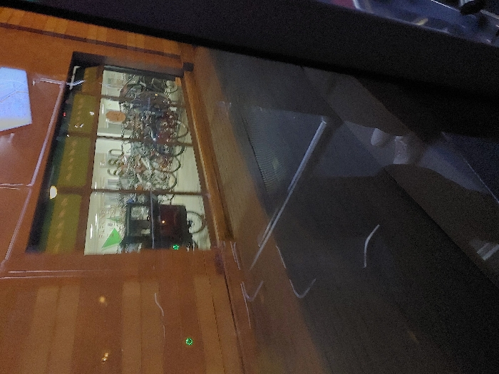 The image presents an exterior view of a brightly lit indoor bicycle parking facility in Strasbourg, France, observed through a large glass window. The interior is densely packed with numerous parked bicycles of various types, including at least one cargo bike with a dark front box visible on the left. A green triangular sign with the word "PARKING" is affixed to the interior wall on the upper left, and a large white number "680" is displayed on the back wall. The building's exterior features an orange-brown, textured facade. The photograph is taken from an outdoor, likely nighttime, perspective, evidenced by the dark foreground which exhibits significant reflections on the glass surface, including faint curvilinear light patterns. A dark, vertical structural element partially frames the right side of the scene. No individuals are visible.