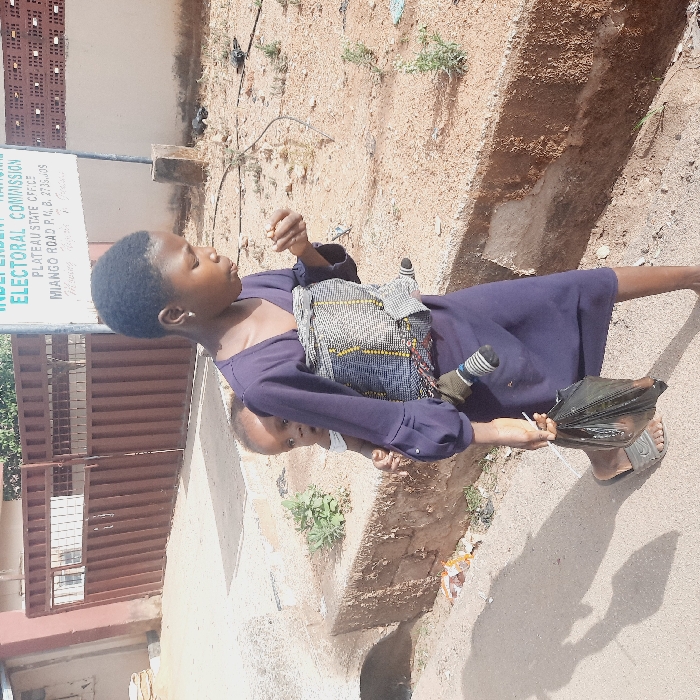 young woman in a blue dress carrying a toddler on her back in a sling. She is walking along a dirt road with a plastic bag in her hand. The woman is looking down at the ground and the toddler is looking at the camera. The scene takes place in Kufang, Nigeria, which is located at latitude 9.863 and longitude 8.867. There is a signpost in the background displaying "Independent Electoral Commission Plateau State Office". There are some plants growing alongside the road and a concrete barrier separating the road from the sidewalk. The road is relatively empty. The woman is wearing a blue dress with a white and black pattern. The toddler is wearing a white t-shirt and blue pants. The plastic bag she is carrying is black and appears to be filled with items.