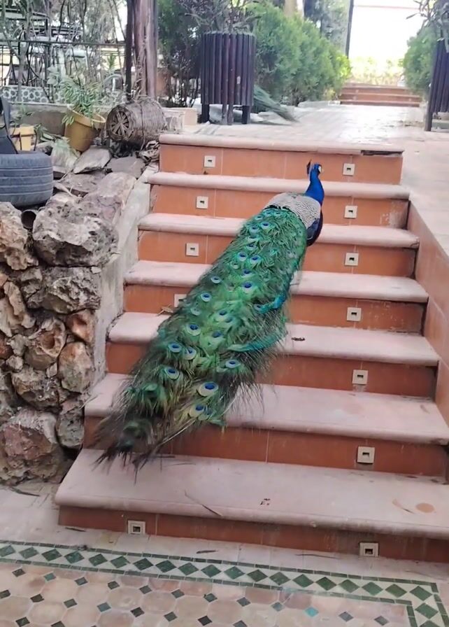 A peacock walks up a flight of tiled stairs in an outdoor setting