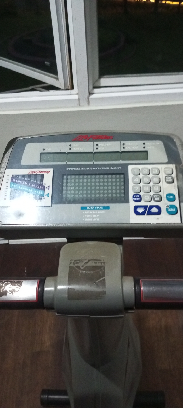 The scene is an indoor view, likely within a fitness area, located in the city of Aral, Kyrgyzstan. The primary subject is the console and handlebars of a "Life Fitness" exercise machine, positioned on a dark reddish-brown wooden surface. The gray plastic console features a digital display panel, currently off or showing zeros, with sections labeled "TIME", "HEART RATE", "RPM", and "TOTAL CAL/HOUR". Below this, a large grid of square, unlit display elements is present. To the right is a numeric keypad (0-9), alongside buttons for "CLEAR/PAUSE", "START", "ENTER", directional arrows (up/down), "RACE ON/OFF", and "WATTS/METS". A sticker instructs to "GRIP HANDLEBAR SENSORS ANYTIME TO GET HEART RATE." A "Quick Start" guide lists "• BEGIN PEDALING • PRESS START • ENTER LEVEL". A "Zone Training" heart rate chart sticker is affixed to the left of the console. The console shows minor surface wear, including scratches and smudges. Directly below the console are the machine's handlebars, which are gray and black with red accents, featuring worn and peeling metallic-effect labels. In the background, behind the exercise machine, is a white-framed window. The left pane of the window is slightly ajar, creating a narrow vertical gap. Through the window, a dark outdoor environment is visible, suggesting evening or night. A faint green ground cover, possibly grass, and a dark circular or oval outline, resembling a path or track with a purple border, are discernible. Distant, indistinct lights are vaguely visible beyond. No individuals are present in the image, and no active operation of the exercise machine is depicted.