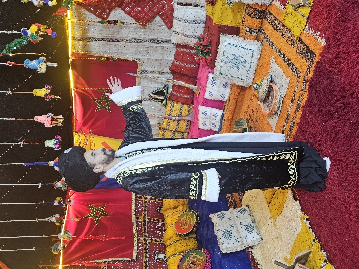 A man in a traditional Moroccan outfit, complete with a black turban and ornate robe, stands with his hand raised. Red Moroccan flags with green stars flank him. Elaborate, colorful textiles and cushions create a vibrant backdrop. The scene is festive and culturally rich, capturing the essence of Moroccan tradition.