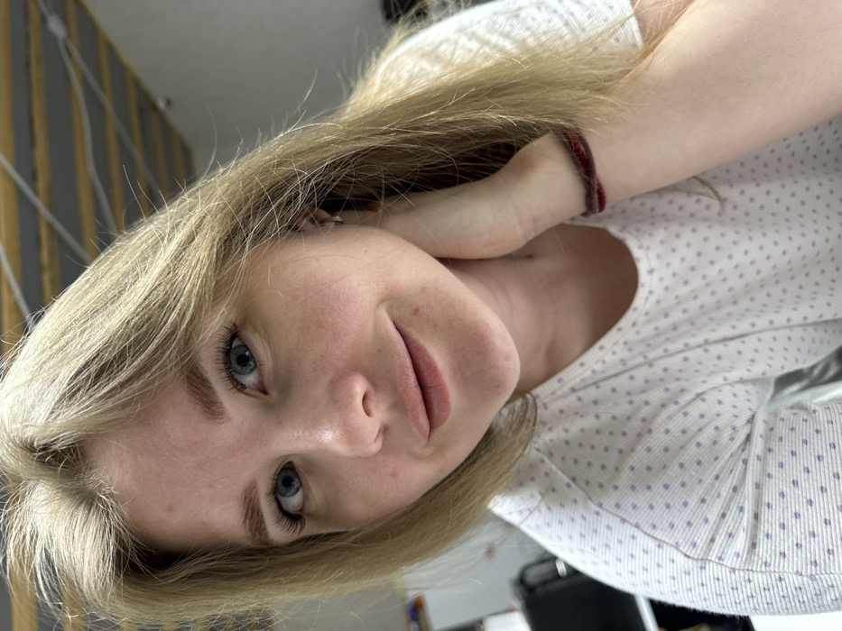 A close-up, head-and-shoulders portrait of an adult female is depicted indoors, purportedly within the city of Горный, Russia. The subject has long, light blonde hair, parted slightly off-center, cascading over her shoulders. Her eyes are blue with visible eyelashes, and her eyebrows are light brown. Her skin is fair with minor freckling on the cheeks. She has a subtle, closed-mouth smile. The subject is wearing a light-colored, short-sleeved top with a textured pattern of small purple dots or stripes. Her right hand is positioned against the left side of her neck and jawline, with fingers gently touching the skin. A dark red, multi-strand bracelet is visible on her right wrist. The background is out of focus, revealing indistinct elements of an indoor environment, including what appears to be part of a light-colored cabinet or appliance and a dark chair on the left. Overhead, a ceiling structure with light-colored beams or supports is partially visible. The scene is illuminated by ambient indoor lighting.