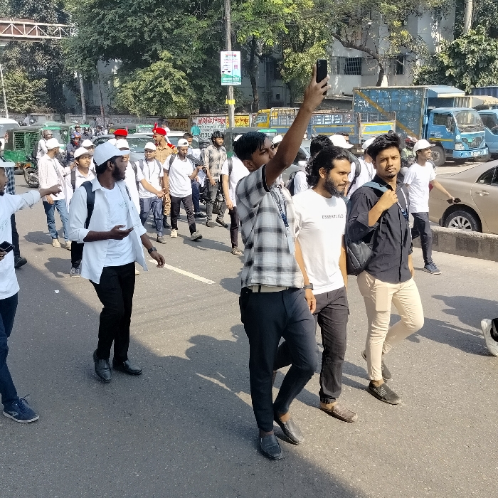 A group of people walks on a street. Most are wearing white shirts and caps. One person in the foreground takes a photo with a phone raised high. Others wear dark shirts or plaid shirts. The background has parked cars, tuk-tuks, and buildings. The day is sunny.