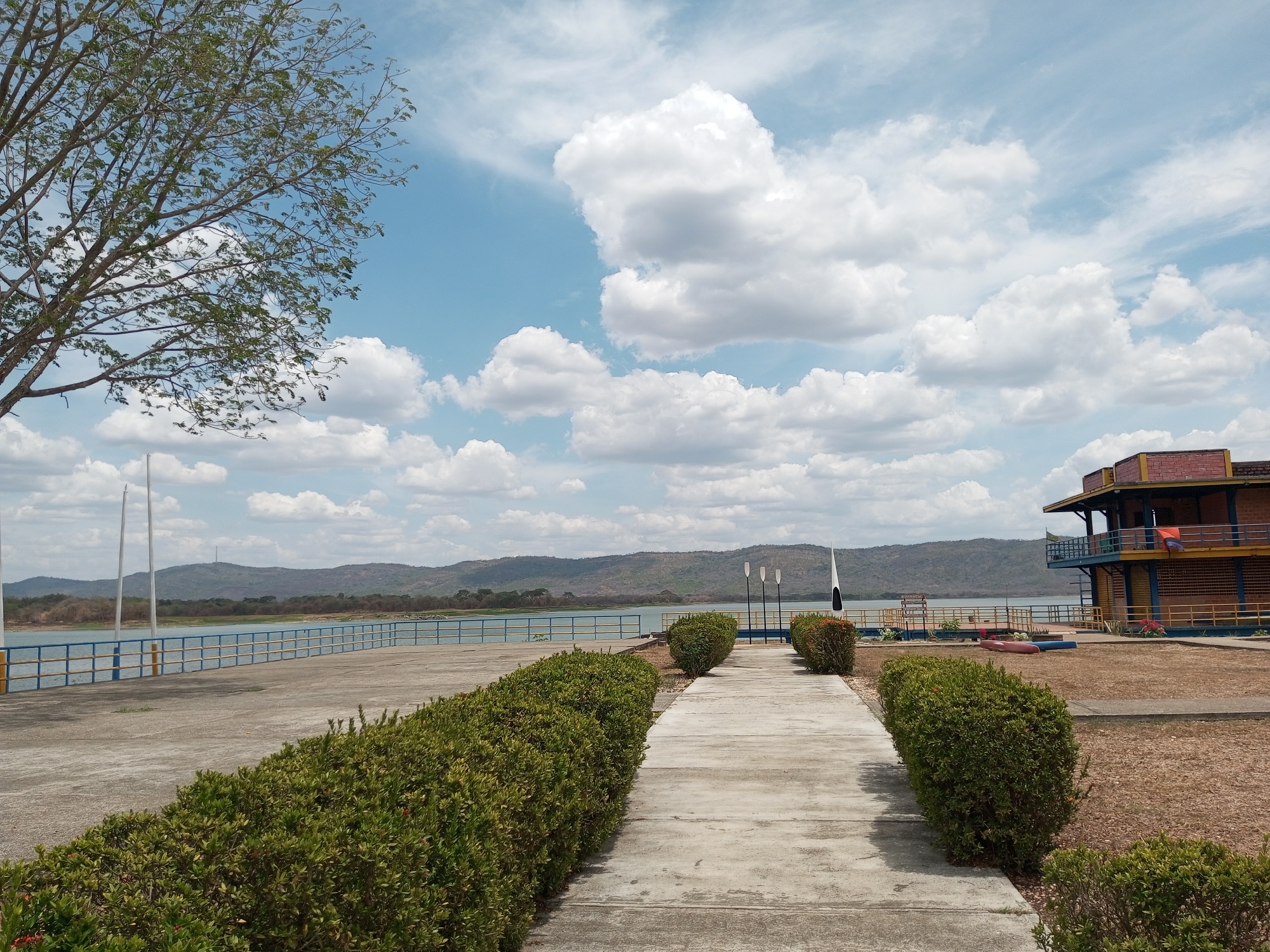 This image depicts a concrete pathway flanked by neatly trimmed green bushes, leading towards a body of water with distant hills. A partially visible tree is on the left edge of the frame. The water is bordered by a blue and yellow metal railing. In the background are rolling hills. A two-story building is to the right. The sky is blue with numerous white clouds. The location is El Pao, Venezuela. There are no people visible.