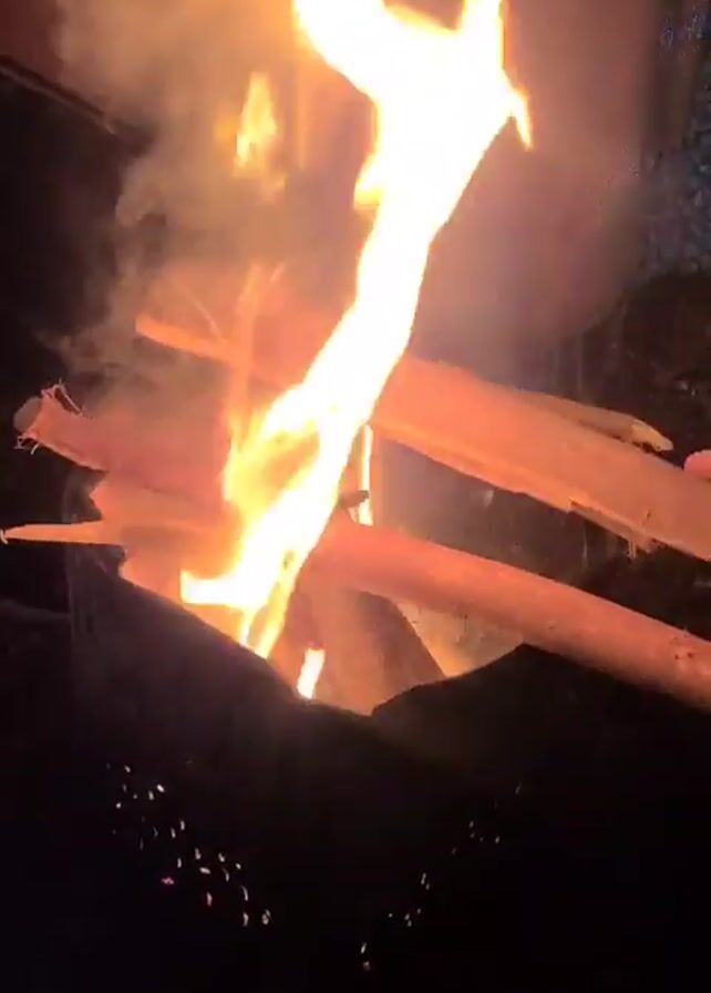 A fire is burning in a fire pit or similar container. A person in a beige shawl or blanket is seated near the fire. The fire is composed of logs and kindling and emits a lot of smoke. The scene appears to be taking place outdoors at night.