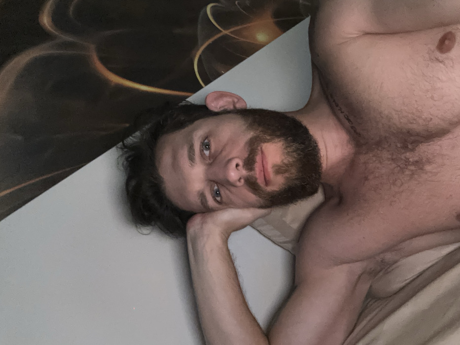 The image displays a single adult male, appearing to be between 30 and 45 years old, positioned horizontally in an indoor setting. He has dark, disheveled hair, blue eyes, and a full, dark beard. He is shirtless, exposing his upper torso with moderate chest hair. A faint, dark-inked tattoo is partially visible on his left upper chest, near the collarbone. His head rests on a light-colored pillow, and his left arm is bent with the hand placed near his head. He is looking directly forward, towards the camera, with a neutral facial expression. The background features a plain, light-colored wall on the left side and a darker surface on the right, which is possibly a wall or a large piece of wall art, displaying glowing, abstract orange and yellow curvilinear patterns. The lighting in the scene is dim and soft. The specific location within Kaliningrad, Russia, cannot be determined from the visual information provided; the setting appears to be a private interior, likely a bedroom.