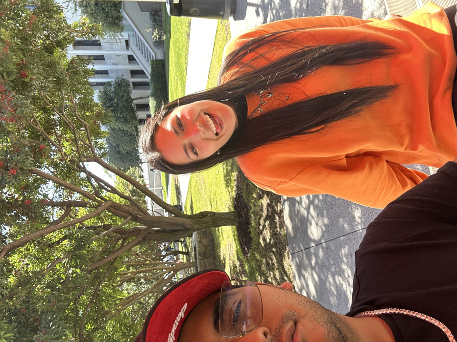 Two people pose outdoors. A woman smiles broadly with what appears to be bright red makeup or dye on her face. She wears an orange sweatshirt and a delicate necklace. A man in a black shirt and red baseball cap partially appears in the frame. They are near a tree with small red berries, a lawn, and a multi-story building in the background. The image is taken in bright daylight, resulting in sharp shadows on the ground.