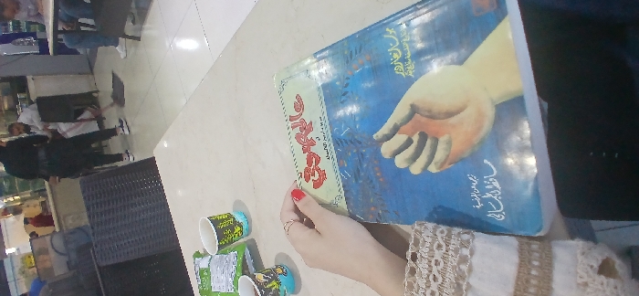 The scene depicts an indoor commercial setting, identified as Al Masnaa, Lebanon, likely a cafe or food court. In the foreground, a person's left hand, adorned with a ring on the index finger and red nail polish, holds a light blue hardcover book titled "عالمي المخملي" (My Velvet World). The person wears a white long-sleeved garment with intricate beige and white lace detailing. The book rests on a light-colored table, next to two disposable cups with green and black patterns, and a green snack bag. In the mid-ground and background, the tiled floor is visible. To the left, a dark-colored wicker-style chair is partially seen. Further back, three individuals are present. One person, dressed in black pants and a black top, is actively sweeping the floor with a mop and dustpan. To their right, a male individual in a white thobe is seated at a table. To the far right, another male wearing blue jeans is partially visible, also seated at a table. The background features a commercial counter area with various appliances and items, suggesting food service. Overhead lighting illuminates the area.