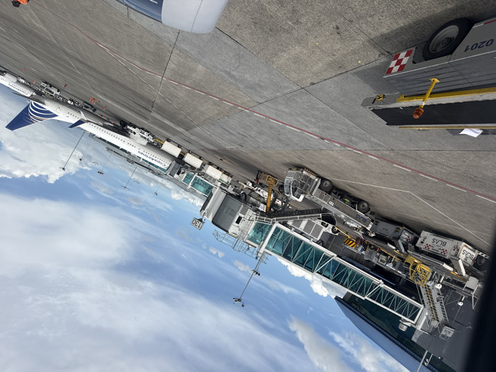 An airport tarmac is visible from an elevated angle. A Copa Airlines plane sits at a gate, connected by a jet bridge. Various airport vehicles and equipment surround the plane and gate. A portion of an airplane wing is visible in the upper left corner of the image. The sky is partly cloudy.