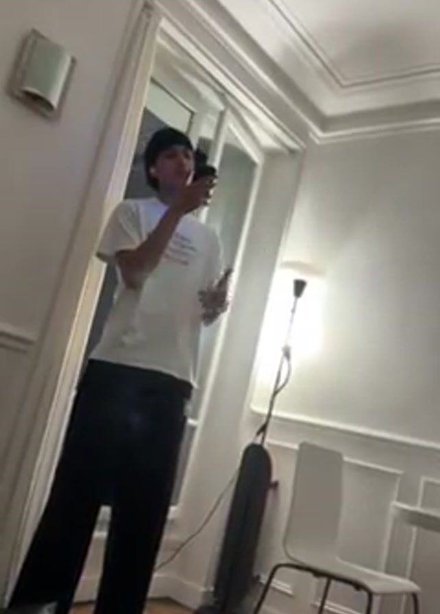 A young man wearing a white t-shirt and dark pants stands in a room, looking at his phone and gesturing with his hands