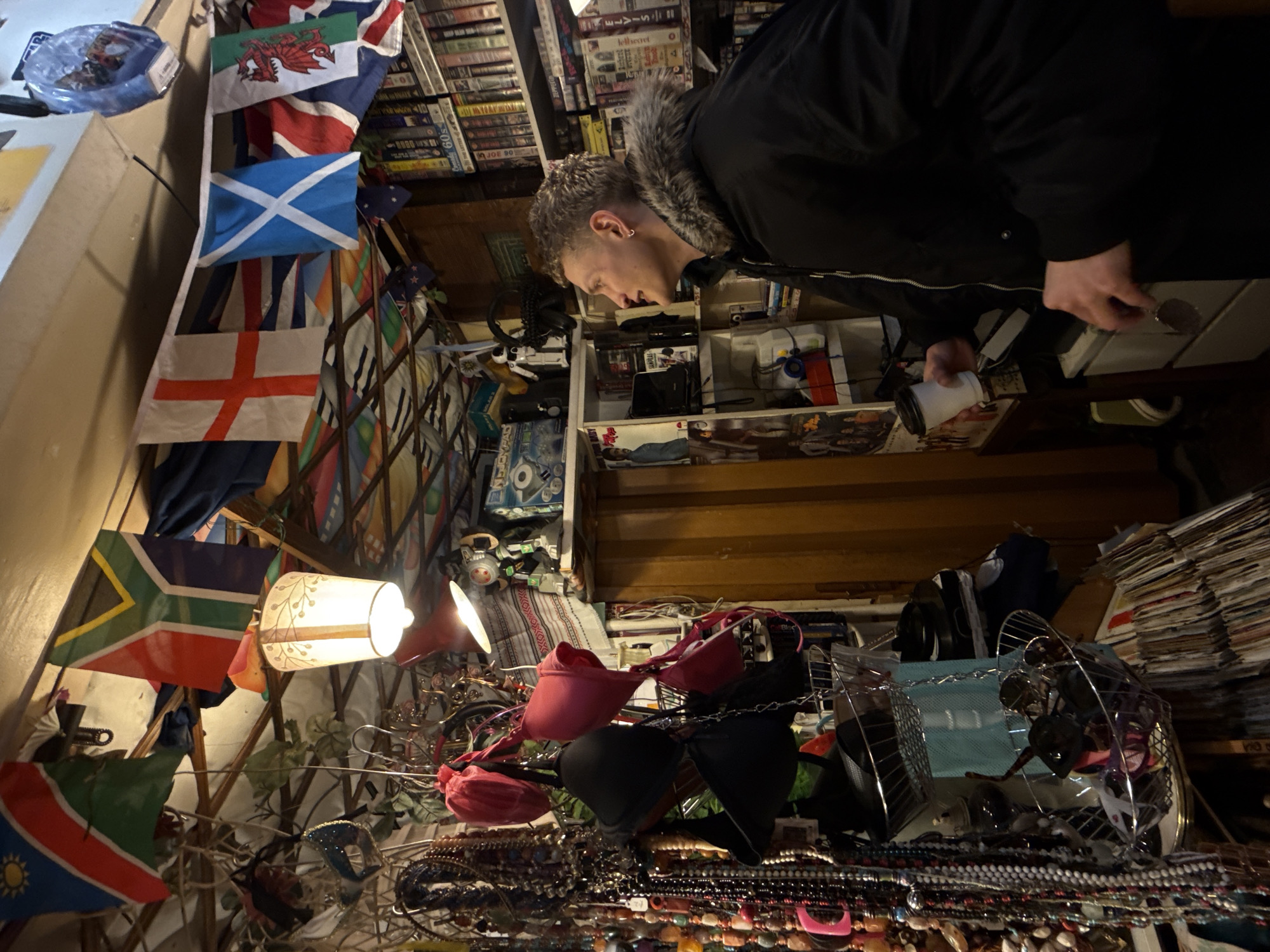 The image depicts the interior of a densely packed retail space, likely a market stall, characterized by a low ceiling adorned with a string of international flags including those of Namibia, South Africa, England (St. George's Cross), Scotland (St. Andrew's Cross), and Wales (Red Dragon). The environment suggests a vibrant market setting in London, United Kingdom, consistent with areas such as Camden Market. A light-skinned male, approximately 25-35 years old, with short, light, curly hair and an earring in his left ear, stands in the mid-ground. He is facing right and looking upwards with an open-mouthed expression. He is wearing a dark, zippered winter jacket with a faux-fur-lined hood. He holds a white disposable cup in his right hand and dark sunglasses in his left hand. To the left, numerous strands of necklaces and beaded jewelry hang vertically, forming a dense display. Interspersed are at least four bras (two pink, two black) suspended from hooks. A decorative white lantern, adorned with a leaf pattern, hangs centrally and is illuminated. Below these items, tiered wire baskets contain various small objects. The lower foreground shows stacks of what appear to be old magazines or records. The background features multiple tall shelving units filled with various media, primarily identifiable as VHS tapes or similar formats, labeled with titles such as "Galaxy," "60s," "Led Zeppelin," and "Elvis." Among the shelved items are a vintage-style boombox, a white robot figurine, and other electronic devices. A wooden wall or partition is visible in the mid-background. A red-colored pendant light fixture hangs near the ceiling on the right side of the frame.