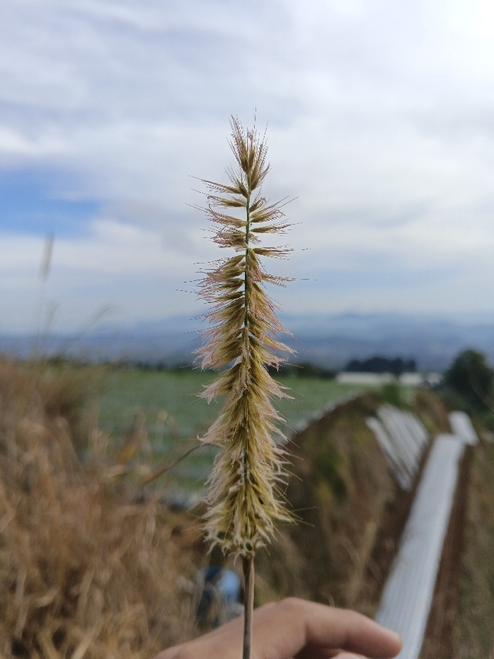 A close-up captures a tall, slender grass stalk in sharp focus, held by a hand. Its textured, yellowish-brown surface features delicate, hair-like protrusions with subtle pinkish hues. The background displays a blurred landscape with greenery, a linear structure covered in white material, and distant mountains beneath a cloudy sky. The image's shallow depth of field draws attention to the grass stalk while softening the details of the surroundings.