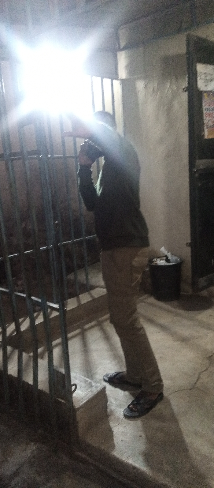 A person stands beside a metal barred staircase. They wear a dark long-sleeved shirt, khaki pants, and black sandals. A bright light source obscures the background. A black trash can sits near a wall next to a closed door. The floor is a concrete surface. The scene appears to be an outdoor area.