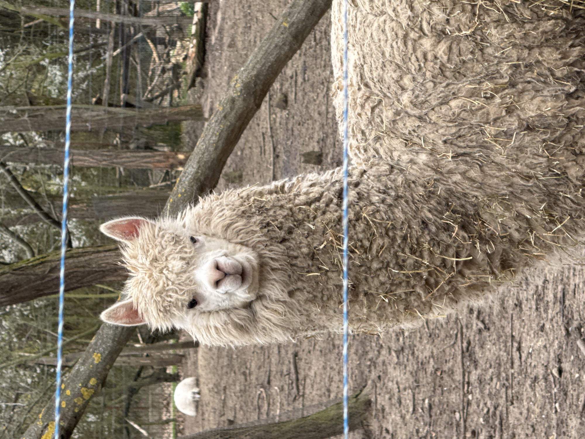 - "An alpaca with dirty white fleece stands in an enclosure, looking directly at the camera through a blue and white rope fence" by FM-RFp9F2, licensed under CC BY 4.0