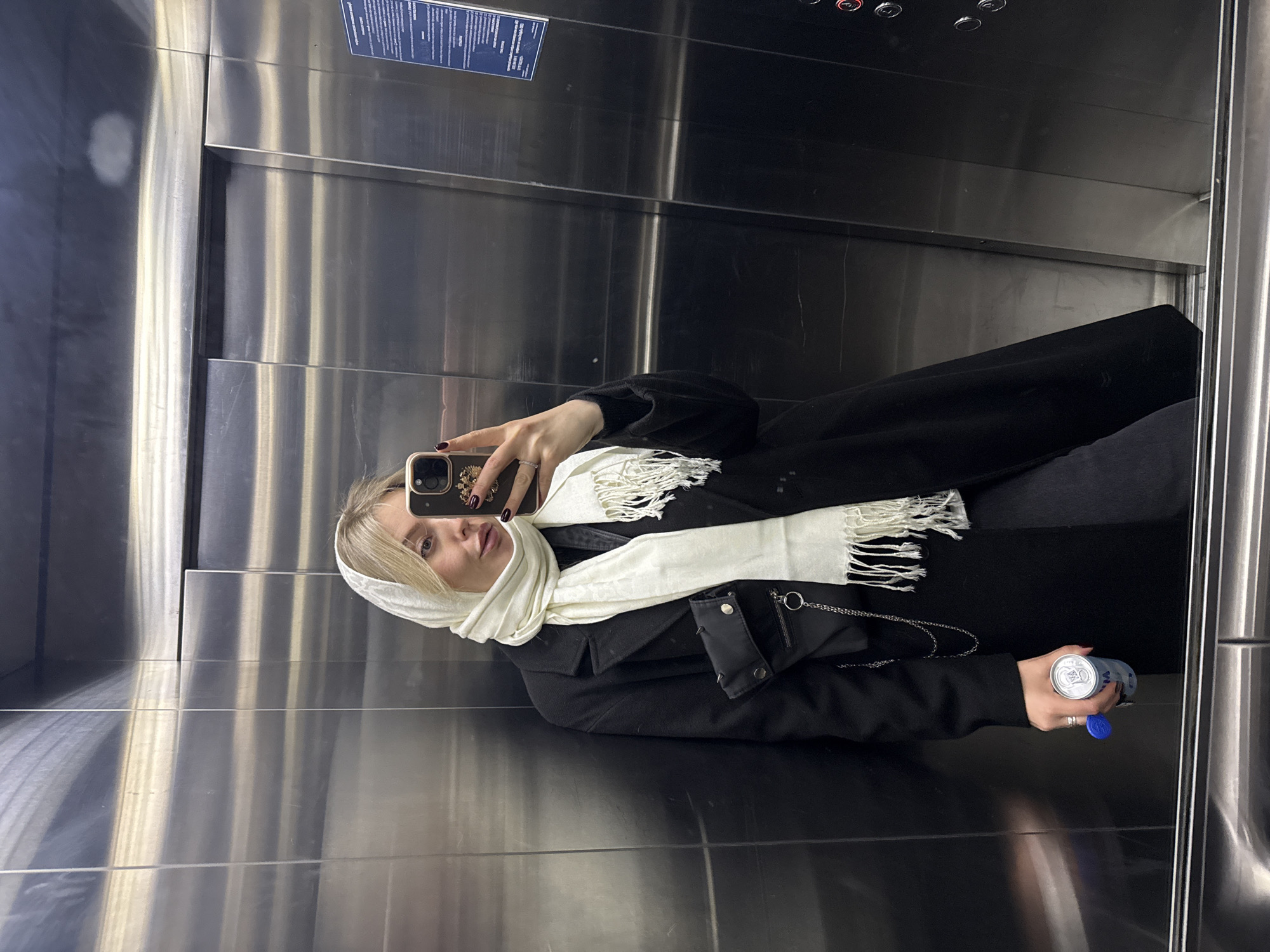 A person stands in an elevator, reflected in its mirrored interior. The individual, presumably female, is wearing a dark coat and a light-colored scarf. She holds a beverage can in her right hand and a smartphone in her left, seemingly taking a selfie. The elevator's walls are metallic and feature vertical stripes. Based on the absence of any visible signage or identifying markers within the elevator and the lack of external context, location in Krasnoyarsk, Russia, is not ascertainable.