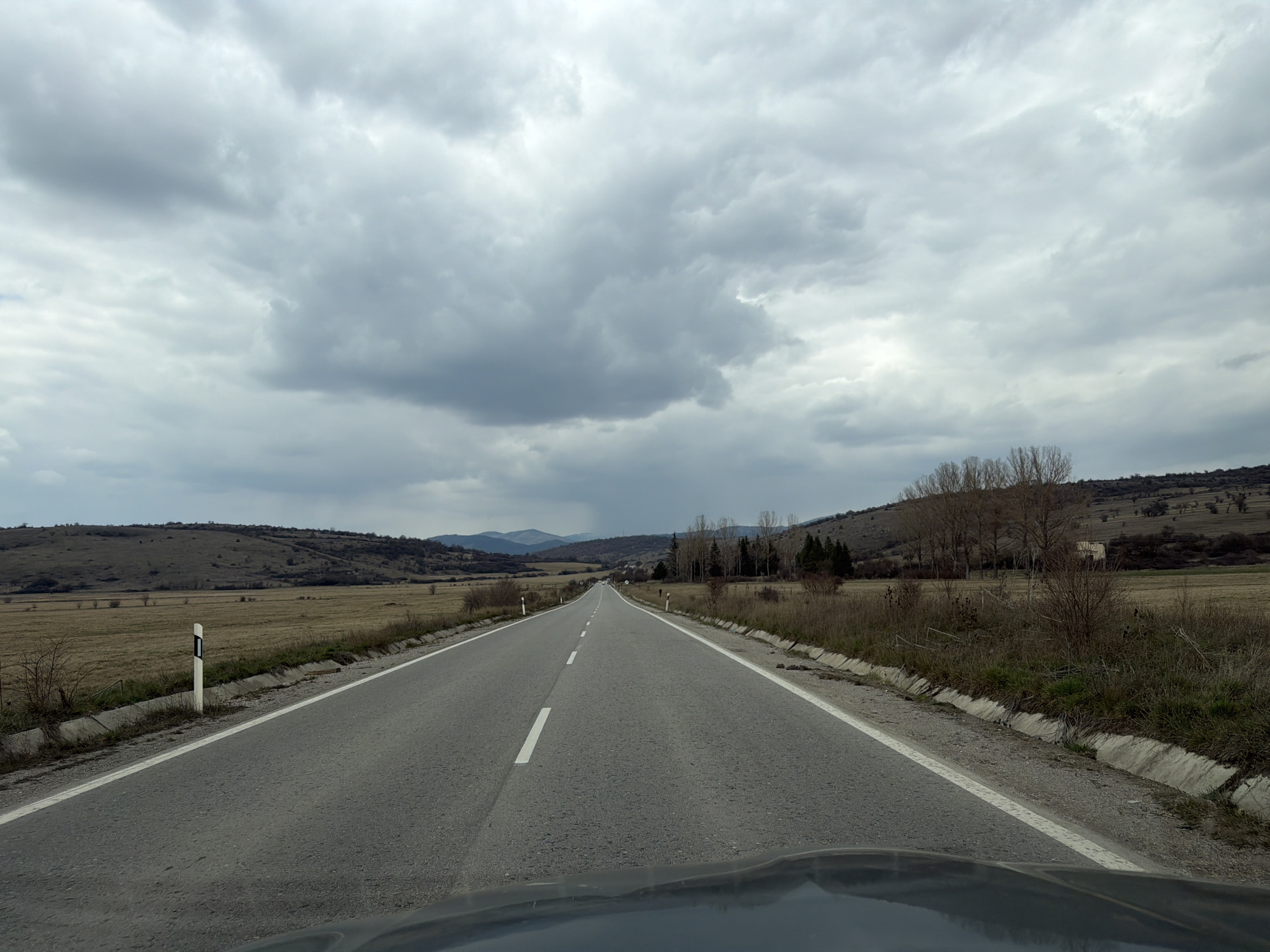 The image presents a forensic view from a vehicle, looking straight ahead down a long, two-lane asphalt road within the city of Drenovo, Bulgaria. The road features a dashed white center line and solid white lines marking the shoulders. Concrete drainage channels run parallel to the road on both sides. Beyond these channels, fields of dry, yellowish-brown grass and sparse, bare deciduous shrubs extend outward. Gently rolling hills, covered in similar dry vegetation, frame the landscape on both the left and right, extending into the background. A single white roadside marker with a black top is visible on the left shoulder in the foreground. In the mid-ground on the right, a light-colored building with a dark roof is partially visible behind a cluster of bare trees. Distant, bluish-gray mountains are faintly discernible on the far horizon. The sky is entirely overcast with thick, gray clouds. No people, animals, or active interactions are observed in the scene. The overall environment suggests a rural or semi-rural setting during a cooler season, likely late autumn, winter, or early spring.