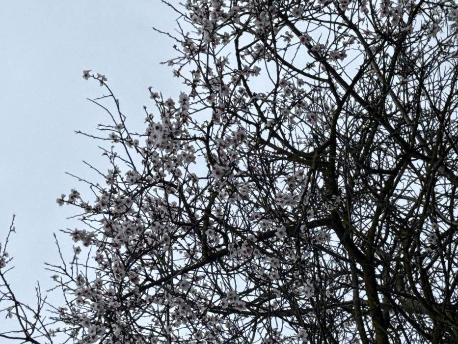 This image depicts a flowering deciduous tree, located in Avren, Bulgaria, observed against an overcast sky. The tree presents a dense network of dark, bare branches, some exhibiting patches of light-colored lichen. Numerous small, five-petaled blossoms are distributed across these branches; the flowers are predominantly white with subtle reddish-pink centers. No foliage is present on the tree. The background consists of a uniform light grey, cloudy sky, visible through the gaps in the branches and above the canopy. No individuals, animals, man-made objects, or active interactions are depicted within the frame.