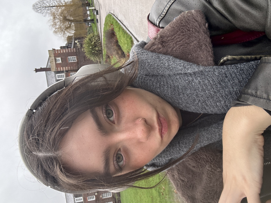 A young female with dark brown hair, light green eyes, and visible freckles on her nose and cheeks is depicted in a close-up outdoor selfie. She wears light grey over-ear headphones, a grey knitted scarf, and a dark brown faux fur-lined jacket over a dark garment, with a dark red strap from a bag visible on her right shoulder. A small silver ring pierces her left nostril. She looks directly at the camera with a slight pout. The background features a paved pathway, green grass, and various shrubs and trees under an overcast sky. Two multi-story red-brick buildings with white-framed windows are visible, one prominently displaying a chimney. This architectural style and surrounding parkland are characteristic of the campus of the University of Hull, located in Kingston upon Hull, United Kingdom.