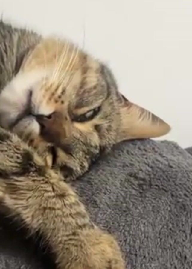 A tabby cat lies curled on a gray plush surface. The cat’s head is nestled on its front paw. Its eyes are squinted open. The cat has brown and tan fur with a brown nose. The background is a plain white wall.