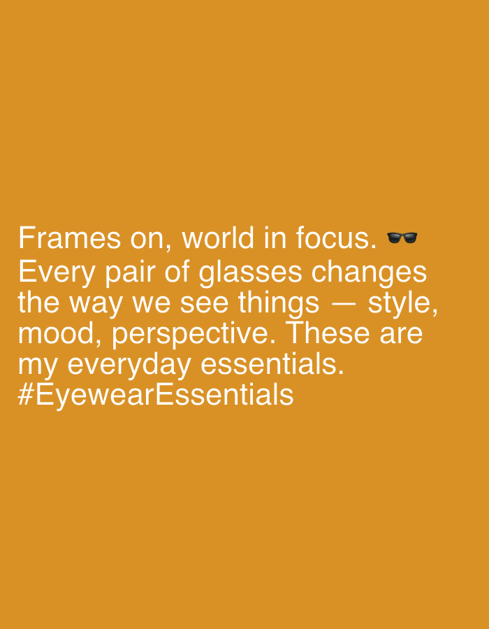 This image is a digital graphic featuring white text against a solid, dark orange background. The text reads: "Frames on, world in focus. 😎 Every pair of glasses changes the way we see things — style, mood, perspective. These are my everyday essentials. #EyewearEssentials". A sunglasses emoji is present after the phrase "world in focus." The image does not depict any physical location, including the city of Berkovitsa, Bulgaria, nor does it show any people, subjects, or objects beyond the text and its background. No actions or interactions are visible. The environment depicted is solely a digital text overlay on a colored field.