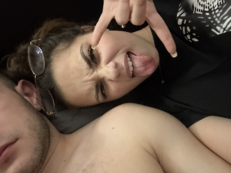 In the city of Atiya, Bulgaria, a close-up image captures two individuals. The left portion of the frame shows the upper chest and lower facial area of a bare-chested male with visible stubble. To his right, a female with dark hair, wearing glasses on her head, is centered. She displays a distinct facial expression, with furrowed brows, narrowed eyes, and an open mouth with her tongue extended. Her left hand is raised, forming a "rock on" gesture. She wears a dark shirt, possibly black, with a white graphic design visible on the lower right, and a silver necklace. The background is uniformly dark and indistinct.
