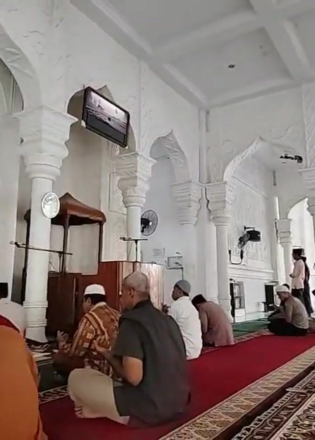 Inside a brightly lit mosque, a group of men are engaged in prayer, positioned on a red and patterned carpet. The interior features prominent white pillars, arched doorways, and a white ceiling adorned with rectangular patterns. A wooden pulpit stands at the front, adjacent to a TV screen mounted on the wall. Several wall-mounted fans are visible, as well as a bookshelf built into the wall. Some men are seated on their knees, while others stand with their hands raised in prayer. The mosque’s overall aesthetic is pristine and well-maintained.