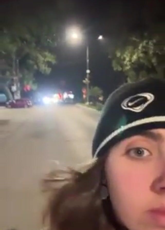 A person wearing a black and white beanie is looking at the camera at night, with their mouth open, while riding a bicycle on a street with street lights. Cars are visible in the background.