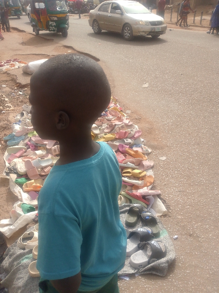 The image depicts a daylight street scene in Jos, Nigeria, indicative of a commercial or market area. In the foreground, a young, dark-skinned child, estimated to be 3-6 years old, is observed from behind, facing right. The child wears a light blue short-sleeved t-shirt and partially visible green shorts. Immediately to the child's right and extending into the midground is an extensive ground-level display of numerous new plastic sandals and slides, exhibiting a variety of colors including pink, white, cream, light blue, green, orange, black, and grey. These footwear items are arranged on light-colored fabric laid directly on the dusty, unpaved ground. The background features an asphalt road with visible cracks and potholes. A light gold sedan (Toyota Corolla) travels from right to left on the road, while further in the distance, a green and yellow Keke Napep (tricycle taxi) displaying the license plate "PTA 5392" also moves leftward. Pedestrians are visible walking on the far side of the road, with indistinct structures present in the distant background. No specific interactions are discernable between the child and other subjects or objects within the frame.