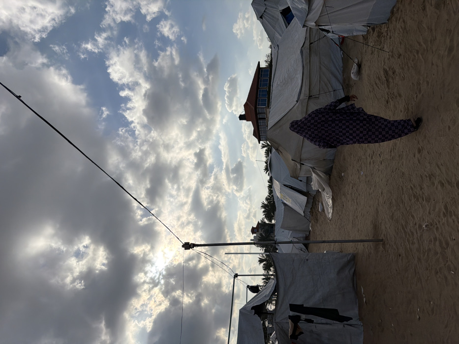 The image depicts an outdoor scene in a-Zawayda, Palestinian Territory, characterized by a sandy ground cover under a sky with extensive cloud cover and areas of visible sunlight. A temporary encampment is present, featuring numerous white and light-colored canvas tents of varying sizes, arranged across the mid-ground and foreground. A single individual, observed from behind, walks away from the camera towards the right side of the frame, clad in a full-length, patterned purple and black garment with a head covering. In the far background, beyond a line of palm trees and tent structures, a multi-story building with a reddish-brown tiled roof and reflective blue windows is discernible. An overhead utility cable, dark in color, traverses the upper portion of the frame diagonally, connecting to a vertical metal support pole situated in the left-center. Dark clothing items are visible hanging on a line or structure near a tent in the left foreground. Minimal scattered debris is present on the sandy surface.