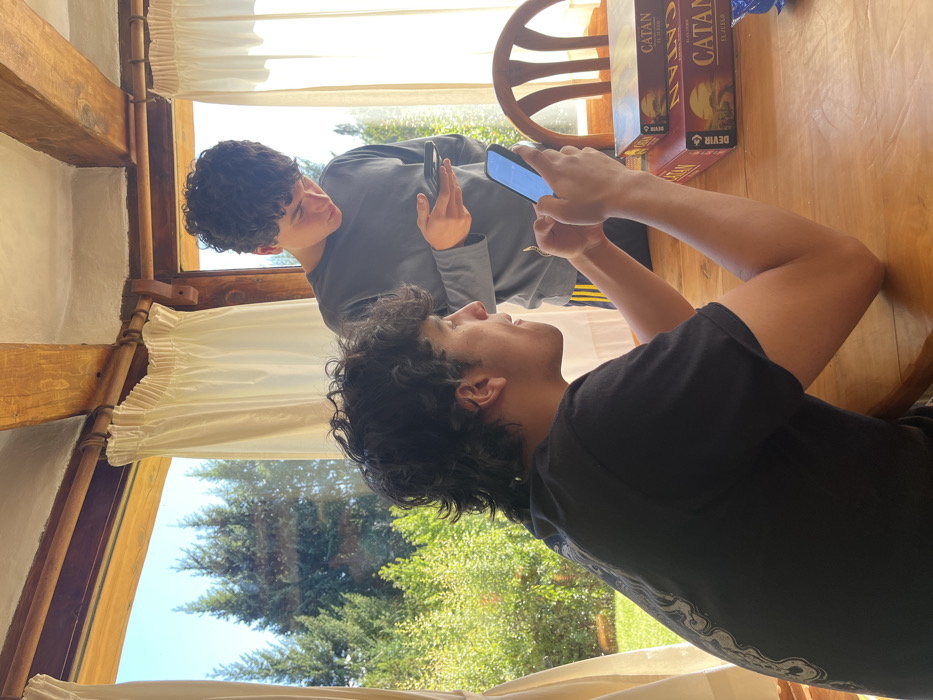 This image depicts two males inside a well-lit room with a large window overlooking a verdant outdoor scene, identified as being in San Carlos de Bariloche, Argentina. The room features exposed wooden ceiling beams and white ruffled curtains. The outdoor environment consists of numerous green trees under a clear sky. In the foreground, a young adult male, presumed to be in his late teens or early twenties, is seated at a light-colored wooden table. He has dark, curly hair styled with longer sections at the back and wears a black short-sleeved t-shirt with a faint light design on the back. He is looking down intently at a smartphone held in both hands, its screen illuminated with a blue light. Behind and to the right of the seated male, a younger male, likely in his mid-teens, stands. He has dark, curly hair and is dressed in a grey long-sleeved shirt and dark pants with yellow vertical stripes. He is also looking down at a smartphone held in both hands. Both individuals are independently focused on their mobile devices. On the table, to the right of the seated individual, two stacked boxes of the board game "Catan" are visible. A portion of a wooden chair with a slatted back is present behind the game boxes. Natural light streams into the room through the large window.