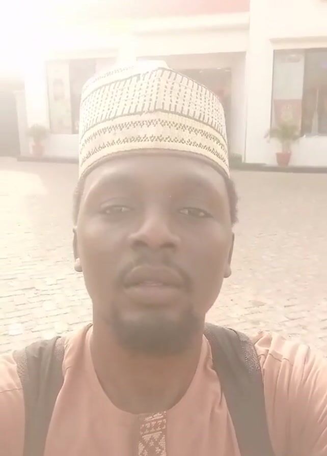 A medium shot shows a man standing outside in front of a building and looking at the camera. The man is dark-skinned and wearing a light brown shirt with a patterned area on the chest. He has a beard and a white cap with brown trim. A black backpack is visible behind him. The building behind him has a sign that says "Republic". There are also signs for "Pie Xpress" and "Snacks". The area appears to be a parking lot or sidewalk paved with light grey brick. The lighting is bright, but slightly washed out.