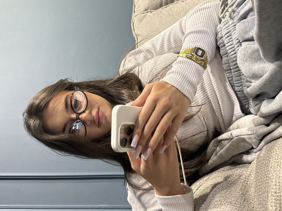 The image captures a close-up, indoor scene featuring a young female individual seated, likely within a residence or a lounge area in Yerevan, Armenia. The subject, possessing long dark hair, wears dark-rimmed oval glasses and is dressed in a light-colored, ribbed long-sleeved top paired with grey sweatpants. She holds a white-cased smartphone (appearing to be an iPhone with triple camera lenses visible) in both hands, positioned in front of her torso, with her gaze directed downwards towards the device's screen, indicating active engagement. Her fingernails are long and manicured with a light, possibly French tip, design. A gold-toned digital watch is visible on her left wrist, and a thin gold chain necklace with a small pendant hangs around her neck. The background consists of a light teal or blue paneled wall on the left side, transitioning to a plainer, possibly textured wall or surface on the right. The subject is seated on a light beige or cream-colored upholstered sofa or cushion, parts of which are visible in the foreground and beneath her.