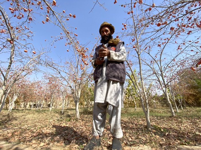 In Bazar-e Panjva'i, Afghanistan, an adult male stands in the center of an orchard