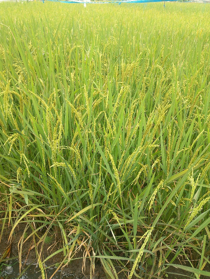 The image displays an extensive rice paddy field located in Ciwalen, Indonesia. The scene is dominated by densely packed green rice plants (Oryza sativa) reaching maturity, characterized by numerous visible golden-yellow panicles containing developing grains. The foreground reveals a dark, wet soil base with some submerged or browning lower plant leaves. The field recedes into the background, where a faint blue netting or tarp structure is visible on the distant horizon. No human or animal subjects are present within the frame. The environment is agricultural, suggesting cultivation activities.