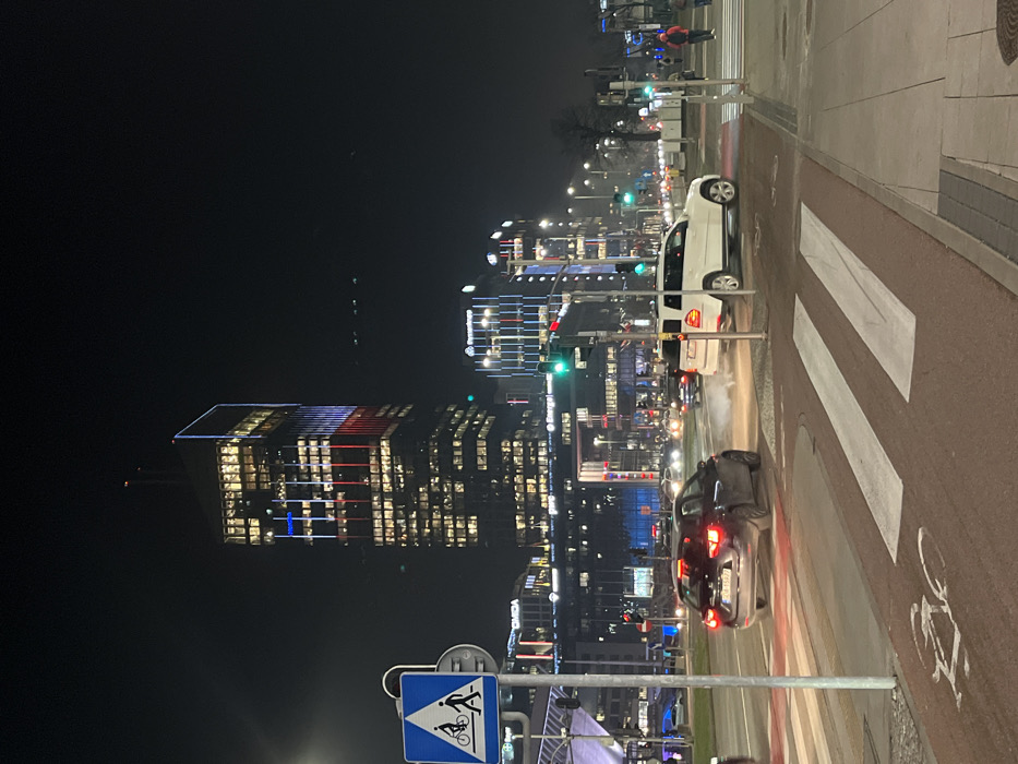 - "A nighttime cityscape features a modern skyscraper with lighted windows and red, white, and blue bands at the top" by FM-UJ0UM2, licensed under CC BY 4.0