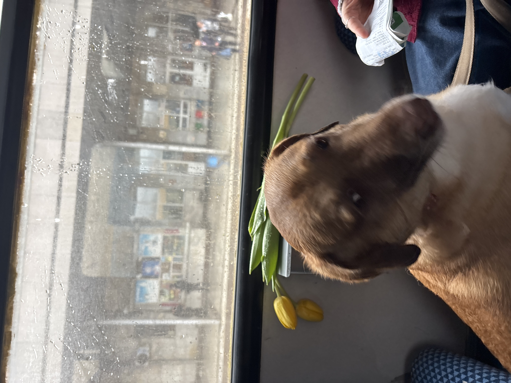 A chocolate labrador dog sits next to a window, alongside a bouquet of unopened yellow tulips. Outside the window, the facade of a building typical of Mezdra, Bulgaria is partially visible. A person holding a receipt is nearby.