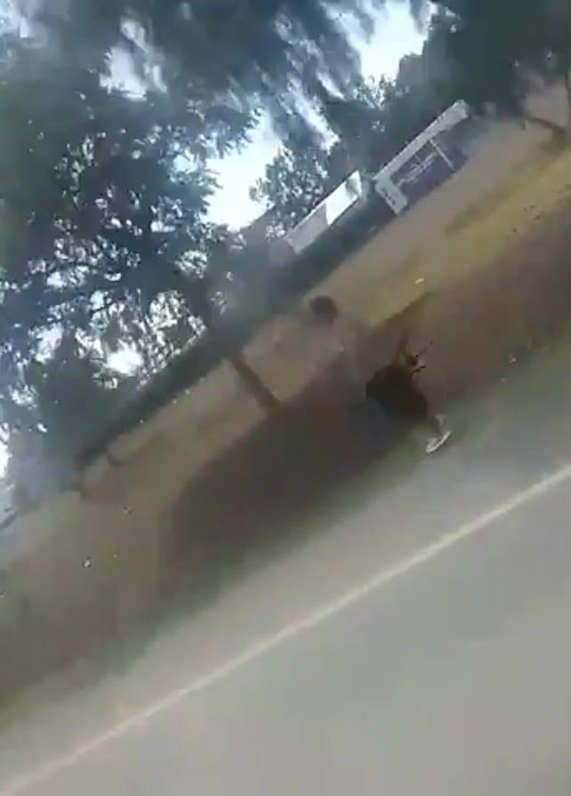 view from a moving vehicle on a paved road. The environment is sunny and lined with trees. The camera is angled to the side, focusing on the landscape passing by. On the side of the road, there's a grassy area with scattered trees and some structures, including what appears to be a bus stop shelter. Several people are visible near the bus stop. There are also multiple cars parked in the vicinity. The camera captures the presence of livestock, including sheep, grazing on the grass near the road. Later in the video, more sheep and cattle, led by a person dressed in a white garment, are seen crossing the road. The scene conveys a rural or semi-rural setting with elements of both human activity and natural environment. There is chatter in the background.