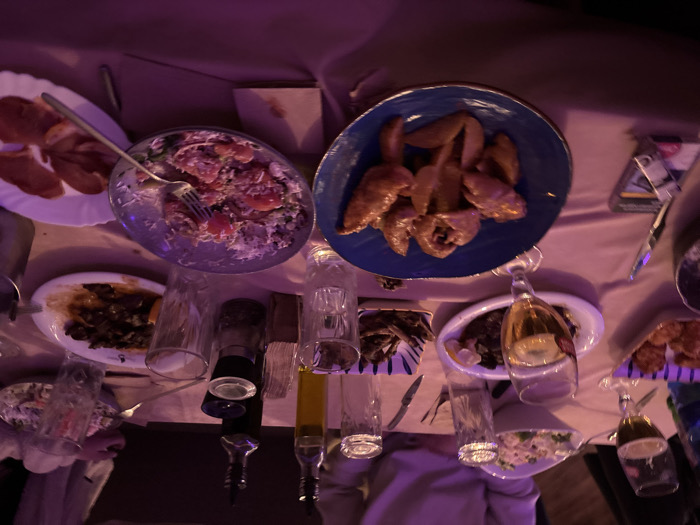 The scene depicts a dining table within a restaurant or tavern setting in Burgas, Bulgaria. The environment is dimly lit with a prominent purple-pink ambient light, which colors the light-toned tablecloth. The table is laden with various dishes and beverages, indicating an ongoing meal for multiple individuals. In the foreground, a blue ceramic plate holds fried chicken wings alongside potato wedges. To its left, a silver-toned bowl contains a partially consumed salad of tomatoes, white grated cheese, and green elements, with a fork resting within. A white oval plate displays deep-fried, orange-colored items, possibly calamari. Further back, another white oval plate holds dark-colored cooked food, potentially meat or mushrooms, accompanied by a lemon wedge. A small rectangular dish with blue stripes contains numerous small, fried fish. A white bowl at the far end of the table contains a lighter-colored salad, and a small white plate on the right presents thin slices of reddish cured meat. Beverages include two tall beer glasses, one full and one partially consumed, along with several clear drinking glasses, some containing water. Condiments and tableware on the table include bottles of olive oil and balsamic vinegar, a dark salt and pepper grinder set, napkins, and various forks and knives. A pack of cigarettes and a lighter are visible on the left side of the table. At least one individual is partially visible at the far side of the table, wearing a light-colored top, with their hands on the table. The background is dark and out of focus, typical of an indoor dining establishment with subdued lighting, with a wooden floor visible in some areas.