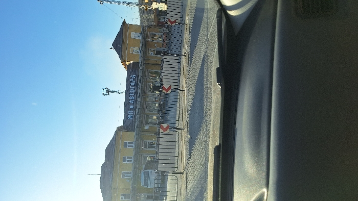 The image displays an exterior scene captured from within a vehicle in Dupnitsa, Bulgaria, facing the local railway and bus station complex under a clear blue sky