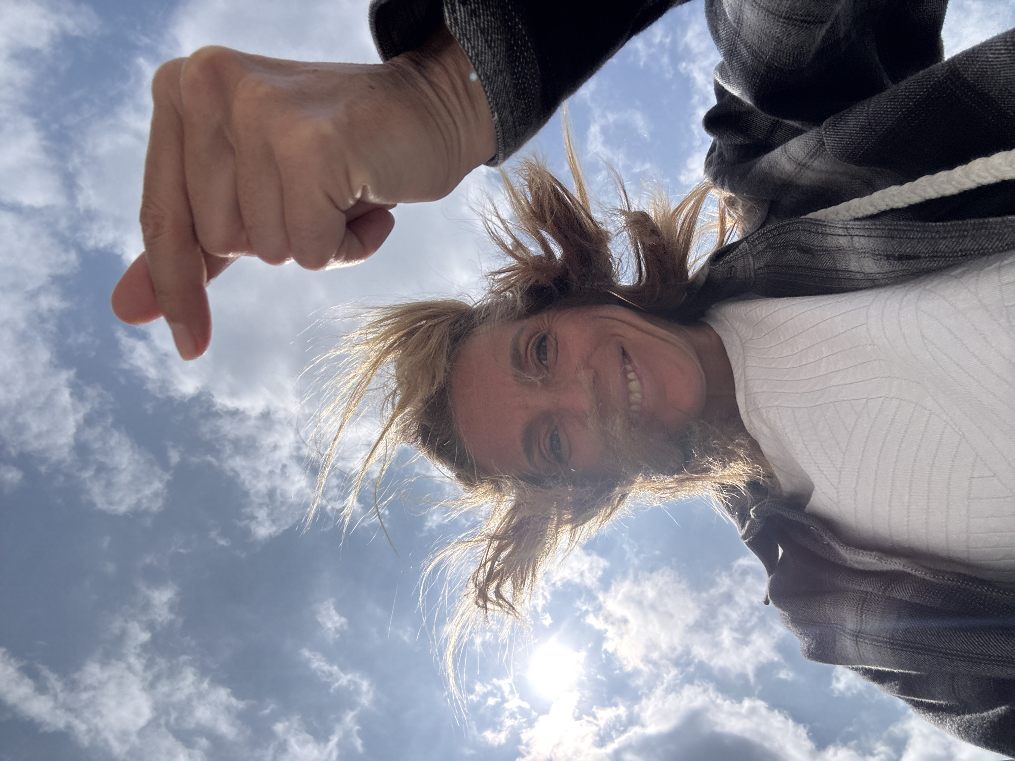 The image is a low-angle selfie taken against a sky with clouds and sunlight