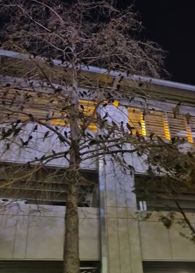 The video presents a nighttime view of a tree densely populated with black birds, possibly crows, perched on its bare branches. The tree stands near a building with modern architectural features. Lights from the building cast a warm glow onto the scene. The sounds of the birds chirping can be heard. There are some cars in the frame below the tree.