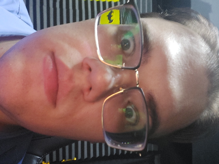 A person wearing glasses is visible in a close-up shot. The glasses have a gold-colored frame. The person's face is turned slightly to the side. The background features black and white vertical stripes, with hints of yellow. The person is wearing a blue shirt. There is a reflection of a Batman logo in the glasses.