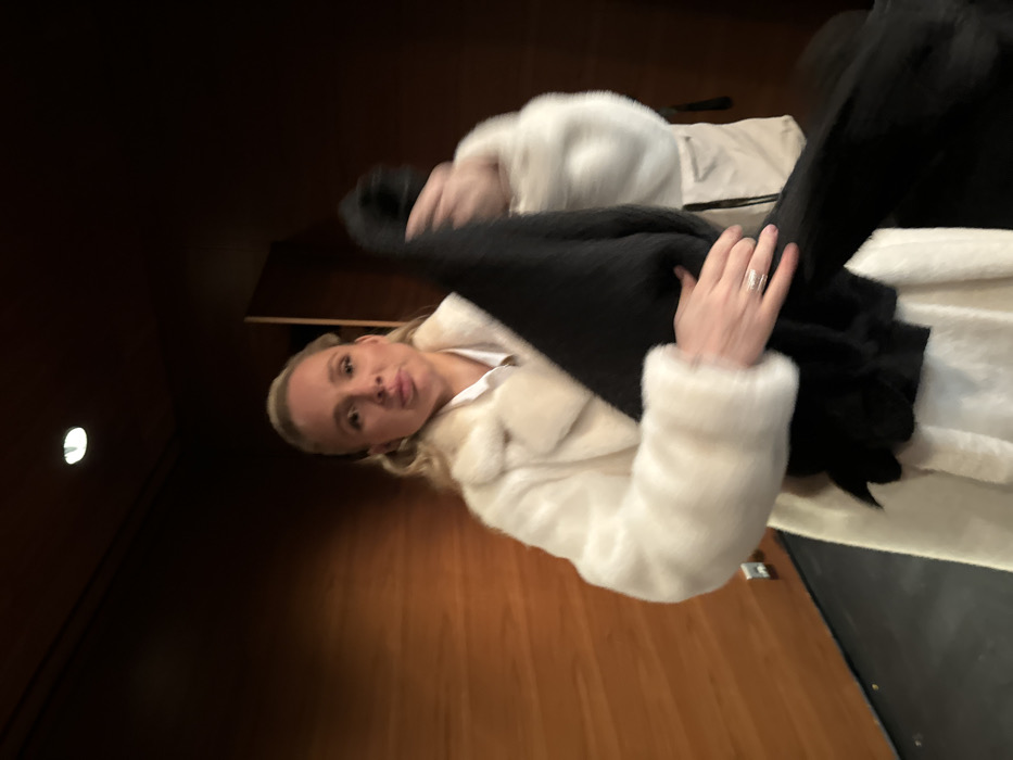 The scene depicts an indoor environment with dark wood-paneled walls featuring horizontal lines, illuminated by overhead recessed artificial lighting. A blonde female, with hair styled in waves and partially pulled back, stands centrally, facing the camera with slightly pursed lips. She is wearing a cream or off-white faux fur coat over a white collared shirt. In front of her, she holds a black garment, possibly a jacket or sweater, with both hands. A silver-colored ring is visible on her right ring finger. Partially visible to her right and slightly behind her is a second individual, wearing a light-colored, possibly beige, jacket. The location is an interior space, such as a lobby or waiting area, within the city of Unknown, Russia.