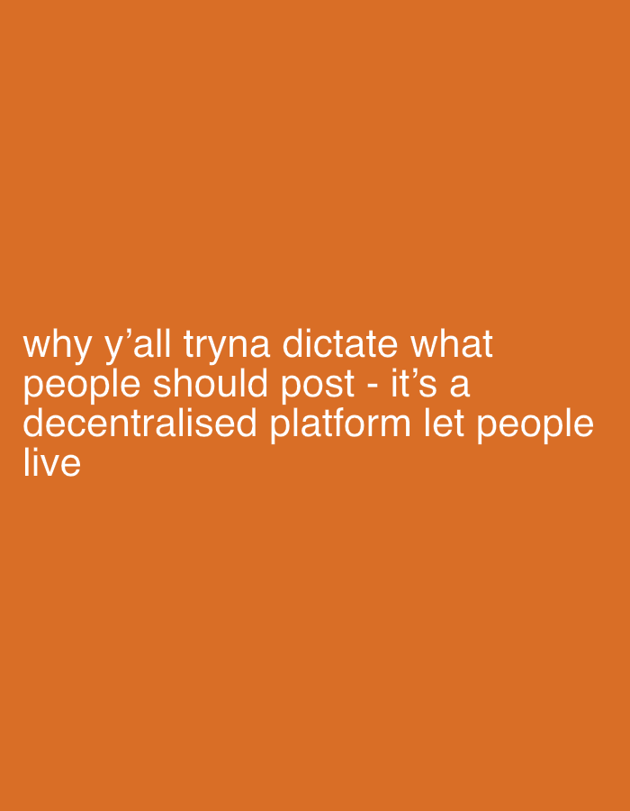 The image displays a solid orange background. White sans-serif text is presented in the lower-left quadrant. The text reads: "why y'all tryna dictate what people should post - it's a decentralised platform let people live". No individuals, specific objects other than the text, actions, or interactions are depicted within the visual content. The environment is a digital display surface. The described scene is located in Wealden, United Kingdom.