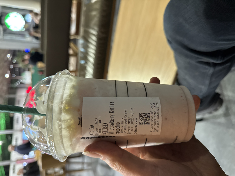 A hand holds a Starbucks drink, a Venti Strawberry Cream Frappuccino, ordered by George to go