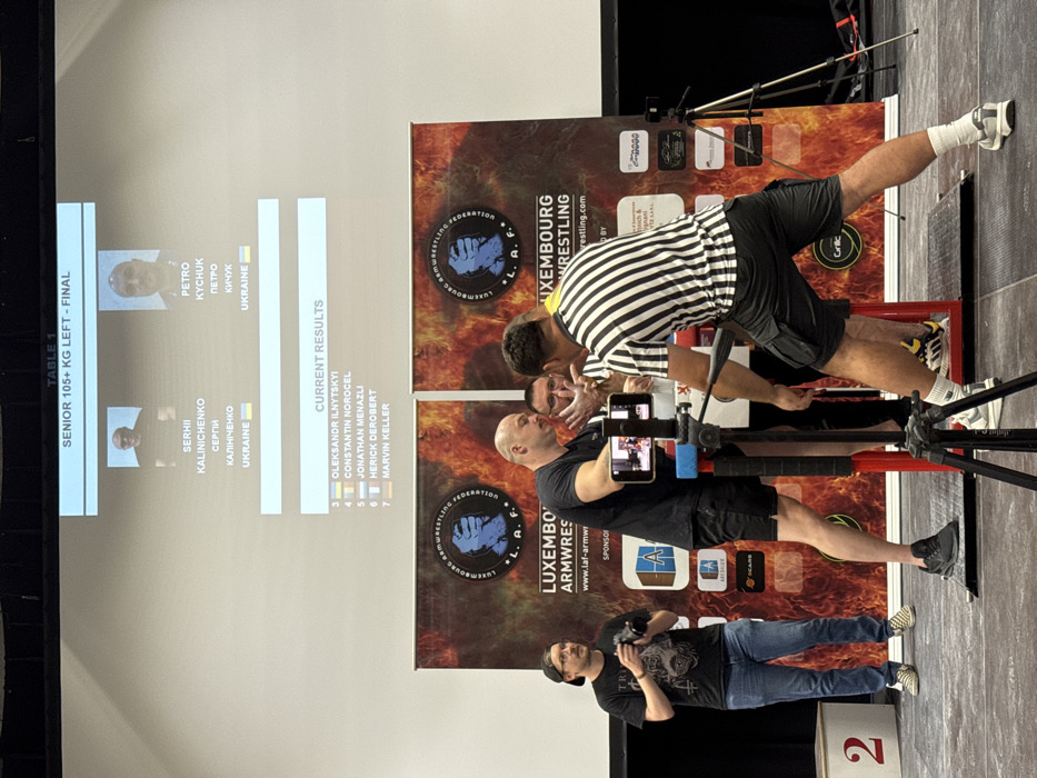 The scene captures an arm wrestling match, officiated by a referee in a striped shirt, and documented by multiple individuals recording with their phones. The backdrop features a banner for the "Luxembourg Armwrestling Federation." A nearby screen displays match information: "Senior 105+ KG Left - Final," listing participants Serhii Kalinichenko and Petro Kychuk, both from Ukraine. The "Current Results" show rankings for other competitors, including Oleksandr Ilnytskyi, Constantin Norocel, Jonathan Menazli, Herick Derobert, and Marvin Keller.
