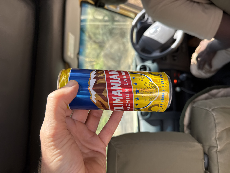 The image displays the interior of a right-hand drive vehicle, located in Lerai Ranger Post, Tanzania. In the foreground, a light-skinned hand holds a slender, blue and gold aluminum can of "Kilimanjaro Premium Lager," which prominently features a mountain graphic and states "4.5% ALC/VOL." The can is positioned in front of a tan upholstered vehicle headrest. In the background, partially visible in the driver's seat, is an individual wearing light-colored clothing; their arm and leg are discernible. The vehicle's dashboard, steering wheel, and a dark roof lining are also visible. Through the front windshield, a blurred sunlit outdoor environment with green foliage is depicted.