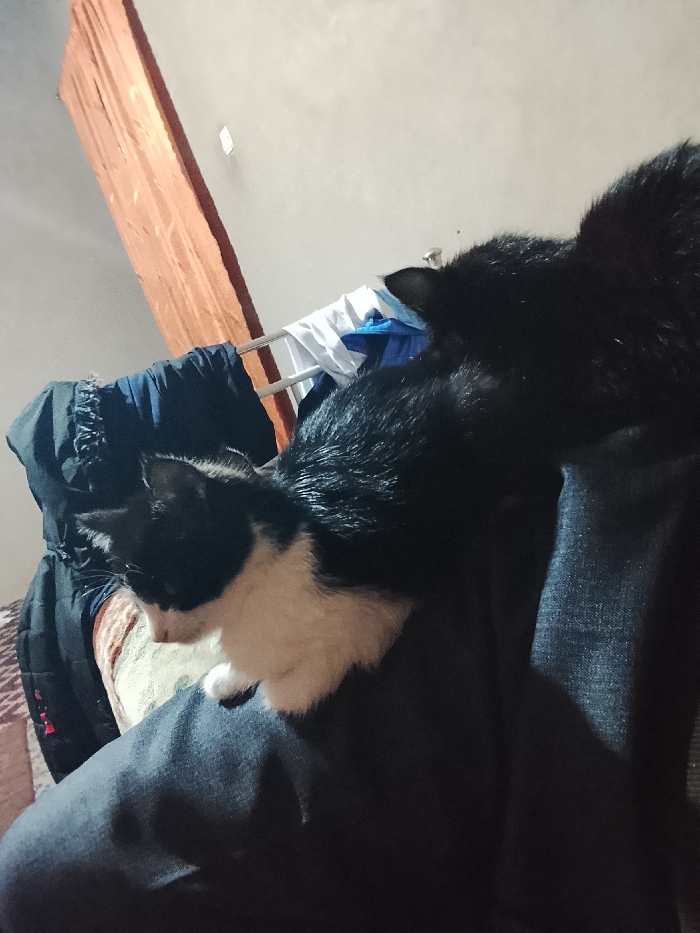 The image displays an indoor scene, likely a residential interior, within the city of Unknown, Unknown. Two felines are situated on a human's lap, partially visible in dark blue denim jeans. The front cat is a black and white tuxedo domestic cat, oriented with its head lowered and facing right, positioned on the left side of the lap. Behind it, on the right side of the lap, rests a predominantly black domestic cat, with its head largely obscured by its body. In the background, a light-colored wall is visible. A vertical reddish-brown wooden panel or beam is present in the upper left. A white metal clothes drying rack holding various garments, including white, blue, and dark-colored items, stands in the mid-left background. A patterned fabric or blanket is visible beneath the cats on the lap.